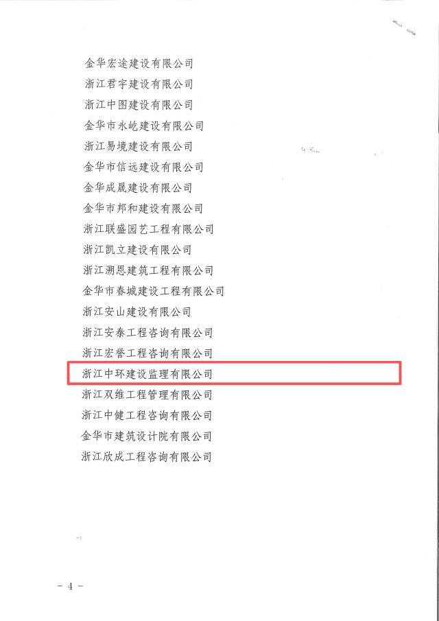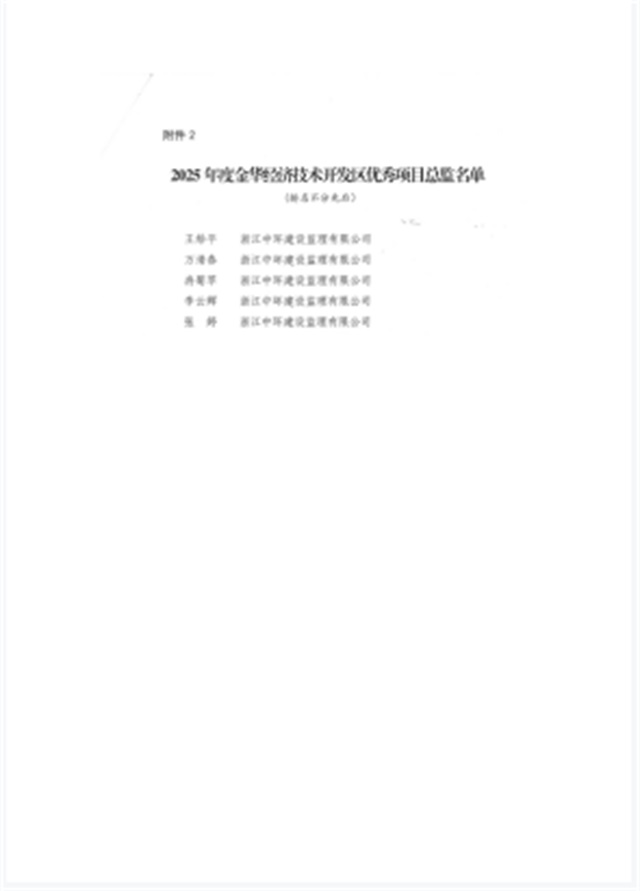 近日,2025 年度金华经济技术开发区建筑业行业表彰结果公布,浙江中环建设监理有限公司凭借稳健的综合实力与良好的行业口碑荣获 “2025 年度金华经济技术开发区建筑业行业先进单位” 称号。公司王给平、万清春、冉菊苹、李云辉、张婷五位项目总监,凭借扎实的专业素养与突出的项目成效,获评 “2025 年度金华经济技术开发区建筑业行业优秀项目总监”。