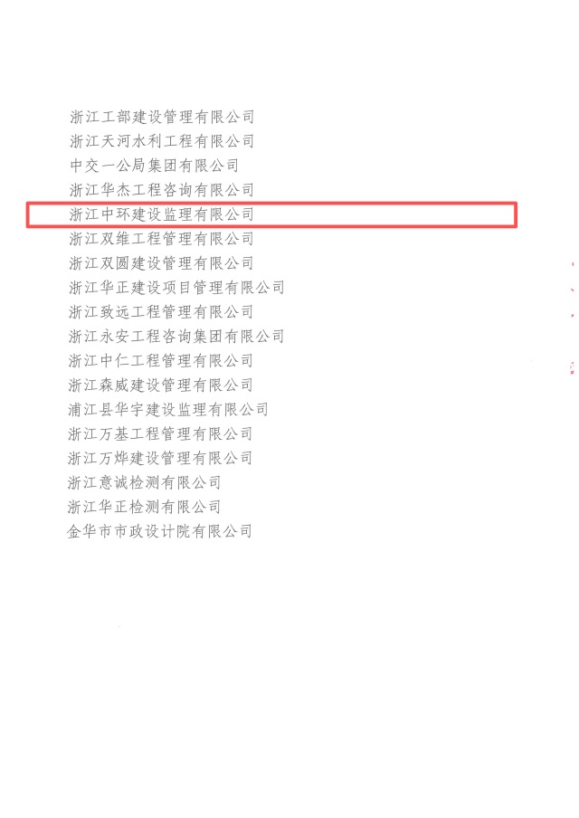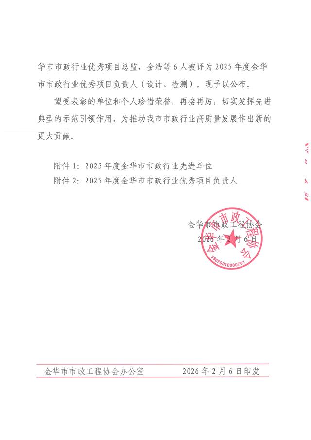 春风传喜报,奋进启新程!近日,金华市市政工程协会正式发布《关于公布2025年度金华市市政行业先进单位、优秀项目负责人的通知》,浙江中环建设监理有限公司再度荣获 “2025年度金华市市政行业先进单位” 称号。同时,公司邵金华、张婷、郑志林、陈孝立、何硕五位项目总监凭借专业履职与突出实绩获评 “2025年度金华市市政行业优秀项目总监” 。