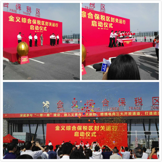 6月30日8时10分,由我公司监理的金义综合保税区项目封关运行启动仪式在主卡口举行。市委副书记、市长暨军民,市委常委、常务副市长陈晓,副市长邵国强等市领导、杭州海关、浙江出入境检验检疫局相关负责人,以及我市各部门主要负责人、金义都市新区管委会、金义综保区建设指挥部班子领导等参加。启动仪式由邵国强主持,金华海关主要负责人宣读海关总署关于金义综保区关区代码和地区代码的批复文件;市长暨军民发表讲话。上午8时21分,载有众美联集团十个集装箱的十辆大货车依次缓缓驶入金义综合保税区(“金义宝”)主卡口,接受通关查验。这标志着“金义宝”这座金华对外开放经济重大功能平台正式封关运行。