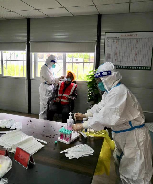 在安全员李晶斋和我方监理人员杨茂喜等人的维持下,现场几百号工人排着队,井然有序地依次接受核酸检测。