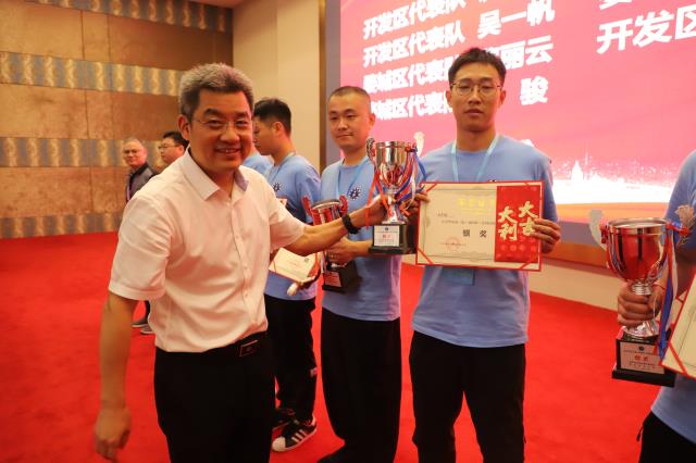我公司派出赖庆庆、程序、吴一帆、陈伟国、马志钢等五名选手代表开发区代表队参加了这次比赛。其中,由吴一帆、陈伟国、马志钢组成的三人团体组荣获团体赛第二名;程序、赖庆庆、吴一帆、马志钢四人分别获个人银奖;陈伟国获铜奖。热烈祝贺之! 在此,特别要表扬到的是,我们的选手程序,带伤作战,在PPT推演单项比赛中取得第一名的好成绩。