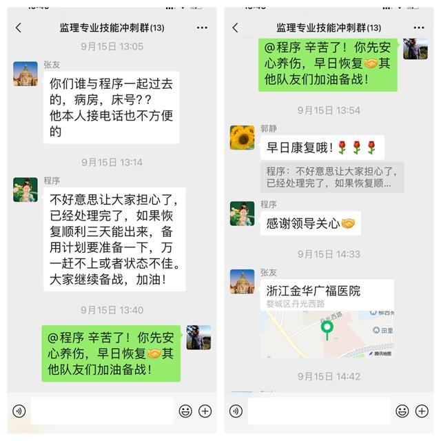 金华市住房和城乡建设局建管处副处长金凌赛后专程来公司回访和探望了程序,对程序带伤参赛的坚强意志和出色表现给予了高度肯定,对取得的好成绩表示祝贺。金处表示,开发区代表队选手们在极短的准备时间内,取得这样的成绩,是中环监理实际综合实力的具体体现。