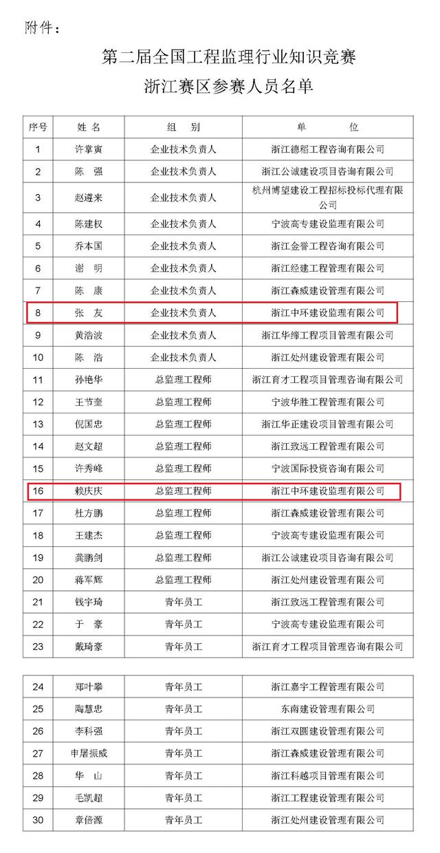 第二届全国工程监理行业知识竞赛浙江赛区参赛名单正式公布,我司张友、赖庆庆凭借扎实的专业功底以优秀成绩脱颖而出,成功入选浙江省代表队,将代表浙江征战全国总决赛!